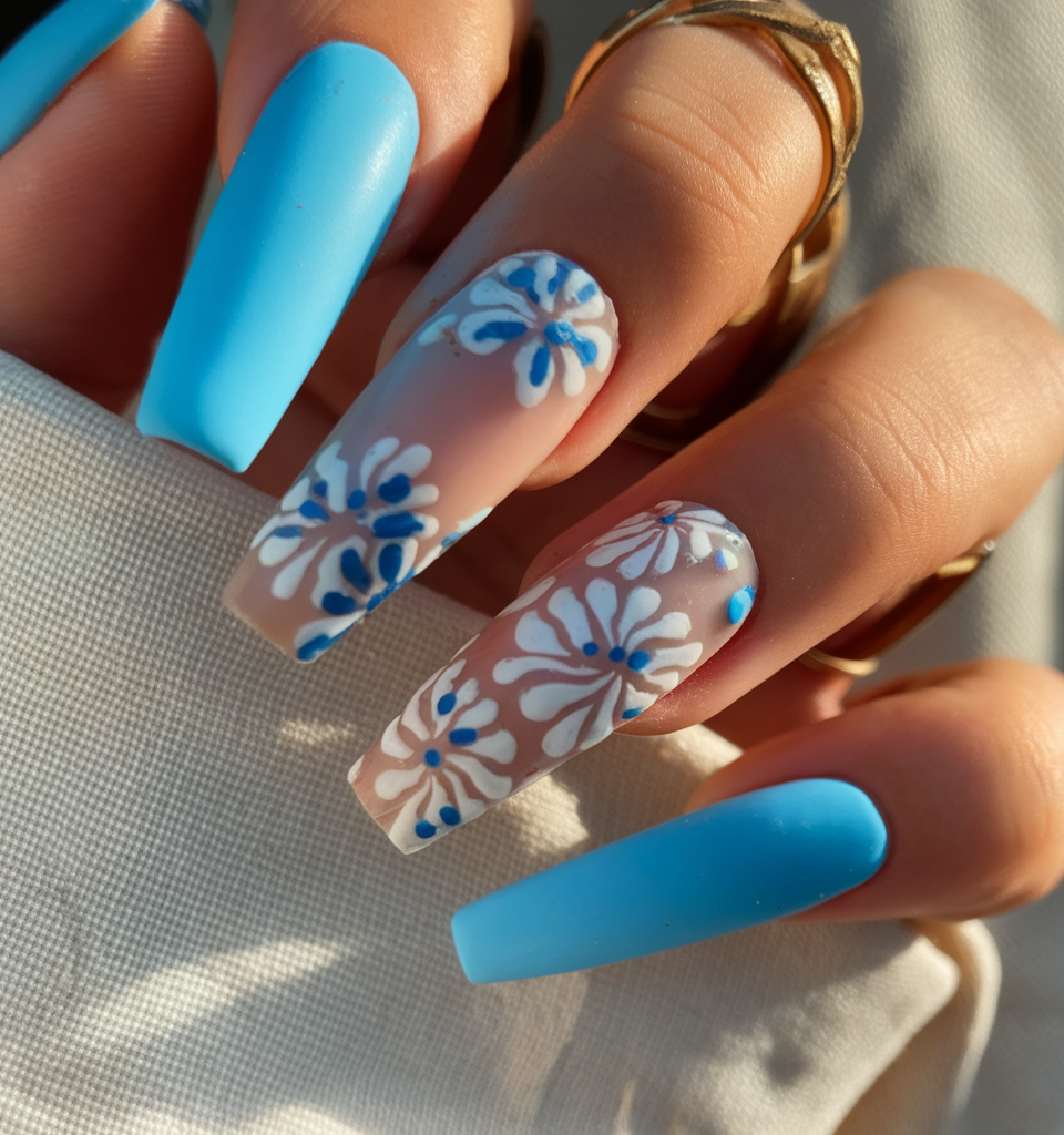 This spring nails coffin 2025 manicure brings a fresh, airy feel with a combination of blue and white floral detailing. A matte blue accent nail balances the delicate, hand-painted flower designs on a sheer base. The intricate petals and fine blue dot details add a whimsical touch. This acrylic simple yet elegant design is a great choice for those who love soft, nature-inspired nails.