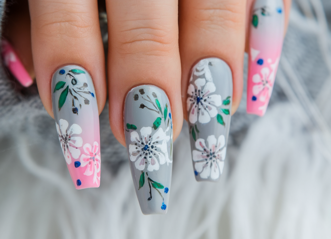 This spring nails coffin 2025 set blends soft gray and pink tones with hand-painted floral details. Delicate white and green flower accents add depth to the design, while the gradient transition between colors creates a dreamy effect. The glossy finish highlights the fine brushwork, making this an elegant yet artistic acrylic pastel look. Ideal for those who appreciate nature-inspired nail art with a touch of sophistication.