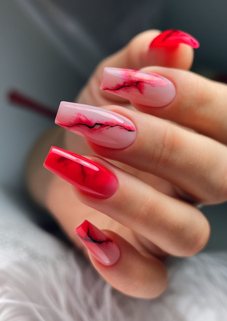 A daring blend of red and black makes this spring nails coffin 2025 look truly stand out. The marble effect on the acrylic simple base mimics natural stone patterns, adding a modern edge. Some nails are left with a softer neutral transition, balancing the intensity of the vibrant red shade. This design is ideal for those who love statement nails with a touch of artistic flair.