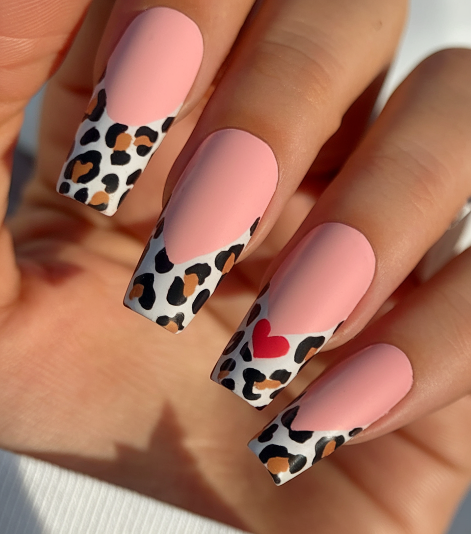 #8 Pink Leopard Print Coffin Nails with a Heart Accent