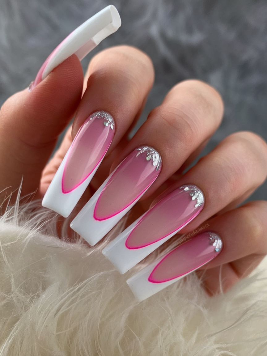 For a luxurious spring nails coffin 2025 aesthetic, this pink and white French manicure offers a sleek, refined design. The elongated, deep white tips are enhanced with a delicate pink outline, creating a chic contrast. Small silver glitter details add a touch of glam, making this acrylic simple look perfect for elegant occasions. The long length enhances the sophistication of this timeless style.