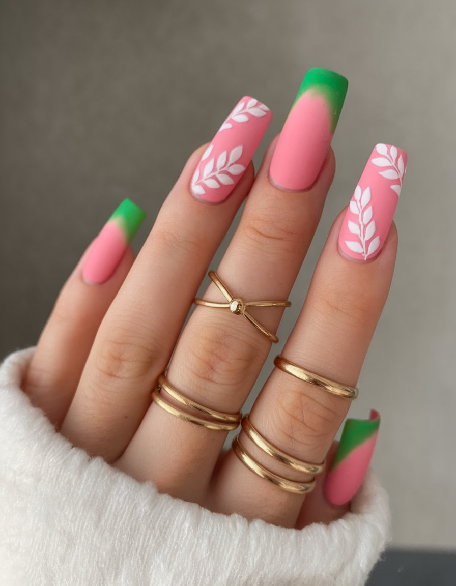 This manicure blends soft pink with a striking green gradient at the tips, creating a fresh, nature-inspired aesthetic. The smooth matte finish keeps the nails looking modern and elegant, while the delicate white leaf patterns add a minimal yet artistic touch. The balance of vibrant green and pastel pink makes this set feel playful and polished.