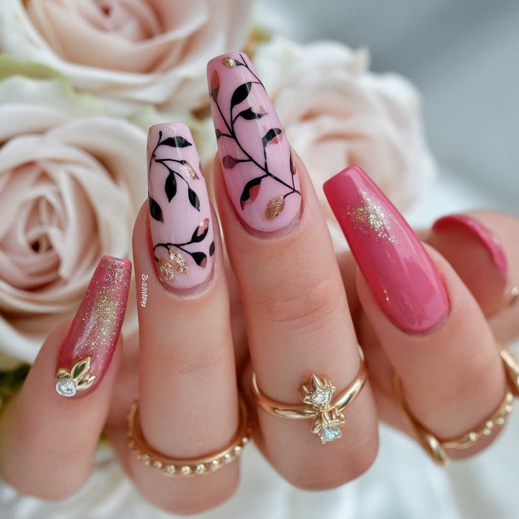 This manicure is a chic combination of soft pink and black, featuring delicate leaf-inspired designs. The translucent pink base enhances the contrast of the bold black branches, while gold glitter details add a subtle shimmer. A glossy pink accent nail and a sparkling rose gold design complete the luxurious look.