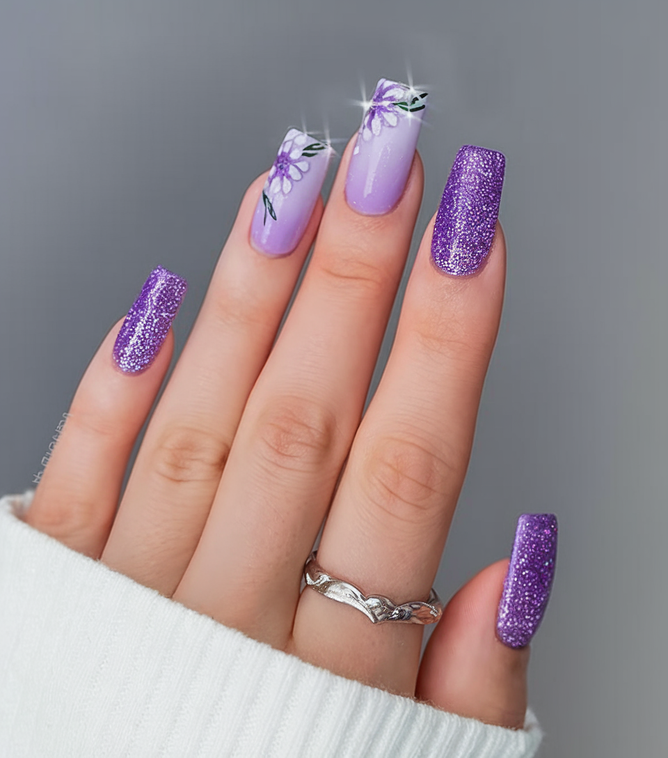 Soft purple hues dominate this dreamy spring nails coffin 2025 manicure, perfect for those who love acrylic pastel looks. A gradient transition from pastel lilac to deep violet adds dimension, while tiny floral accents give a delicate touch. The glitter finish enhances the shine, making these nails stand out effortlessly. This cute and feminine design captures the beauty of spring.