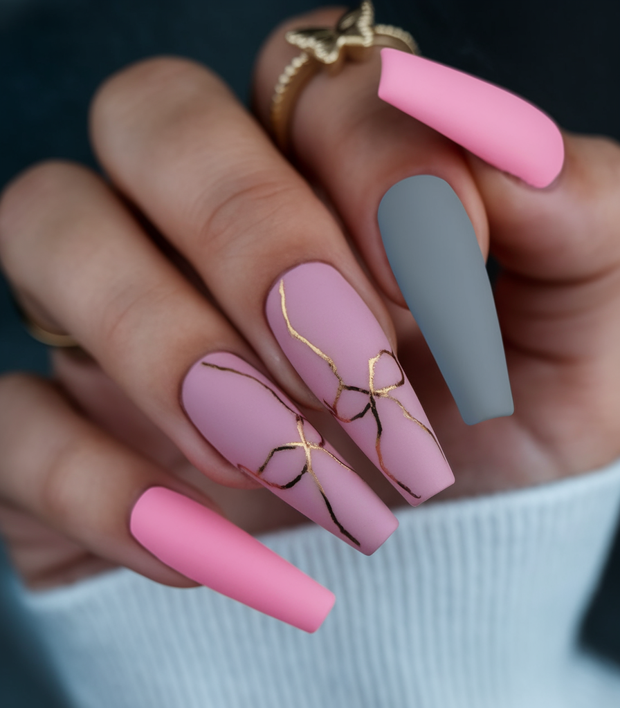 #23 Matte Pink and Grey Coffin Nails with Gold Accents