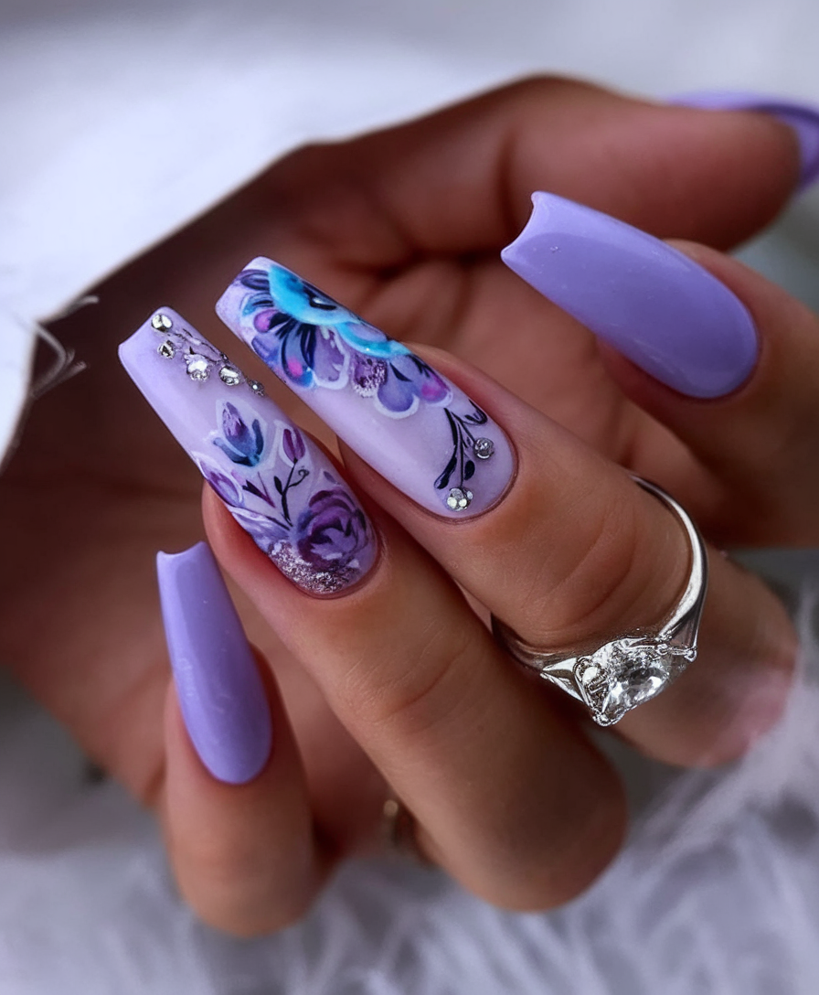 For lovers of purple, this spring nails coffin 2025 set is the ultimate dreamy manicure. The long acrylic nails feature a soft pastel purple base, enhanced with intricate hand-painted floral designs in blue and darker violet. Delicate rhinestones add a sparkling detail, making the design feel both elegant and whimsical. This look is perfect for anyone wanting a fresh, floral-inspired style with a touch of glamour.