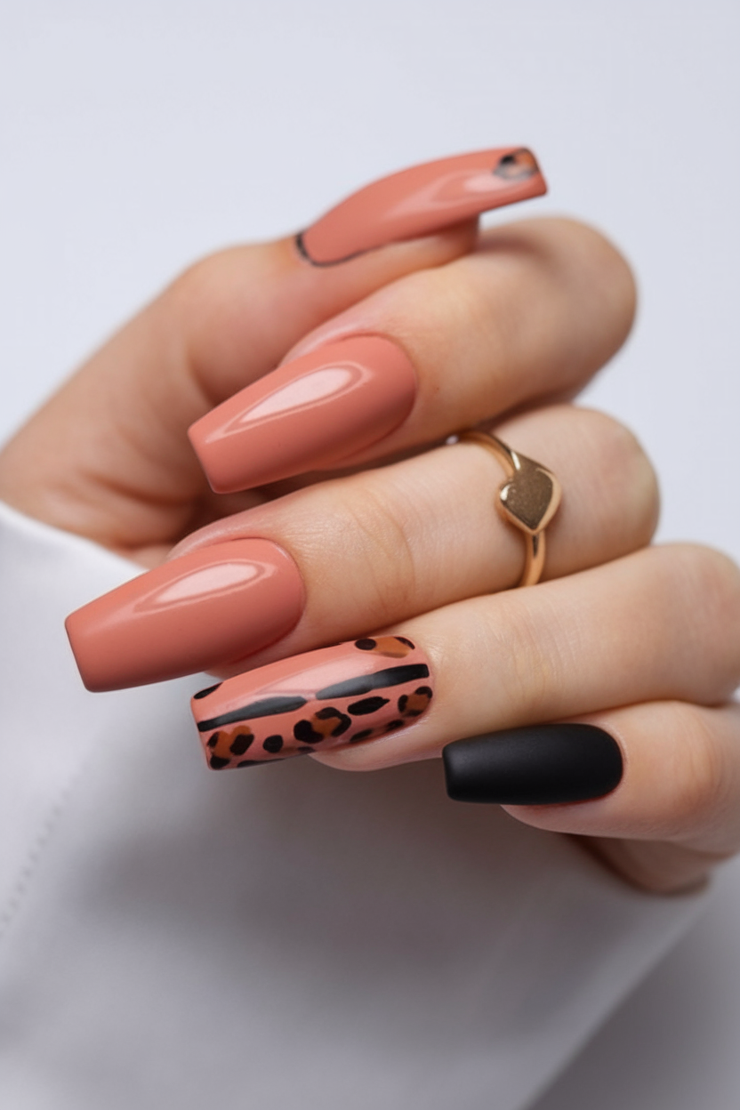 This spring nails coffin 2025 design combines warm neutral tones with a touch of wild elegance. The glossy terracotta base is complemented by a sleek black matte accent nail for a modern twist. A statement nail with leopard print details and bold stripes adds a fierce yet refined touch. The long coffin shape enhances the bold design, making this a standout choice for those who love a mix of classic and edgy styles.