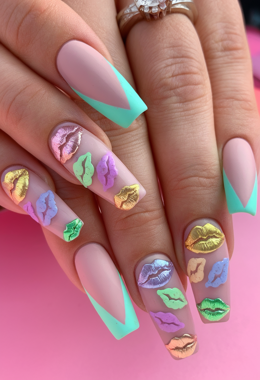 For a playful spring nails coffin 2025 look, this manicure embraces pastel hues with a fun, bold twist. The acrylic pastel base blends soft pink with sharp mint-green French tips for a unique contrast. Embossed metallic kiss prints in yellow, blue, green, and purple add a 3D effect, making this design both eye-catching and creative. The long coffin shape ensures plenty of space to showcase the intricate details.