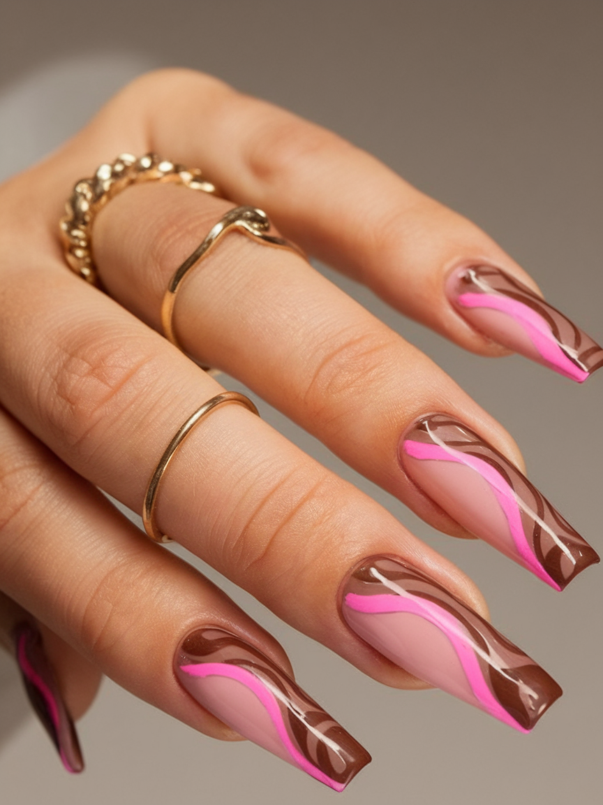 Rich and indulgent, this spring nails coffin 2025 set takes inspiration from decadent sweets. The brown, pink, and neutral swirls create a fluid, dynamic look that mimics melted chocolate with a touch of vibrant color. A glossy finish adds depth and shine, highlighting the intricate designs on each nail. This acrylic simple yet artistic look is perfect for anyone wanting a trendy yet sophisticated manicure this season.
