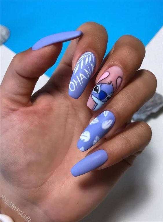 Dive into the cool ocean hues with these delightful summer long nails 2024. The serene blue base coat evokes the clear skies of a perfect summer day, while a charming animated character brings a touch of whimsy. This design is ideal for those who carry a piece of childhood in their hearts, yet stride with a contemporary beat. The playful “OHANA” inscription reminds us of the warmth of family gatherings during summer holidays, making this nail art a conversation starter at any beach party or backyard BBQ.