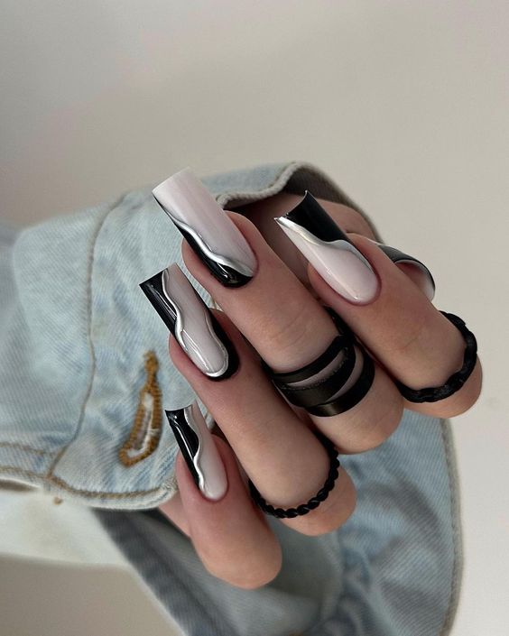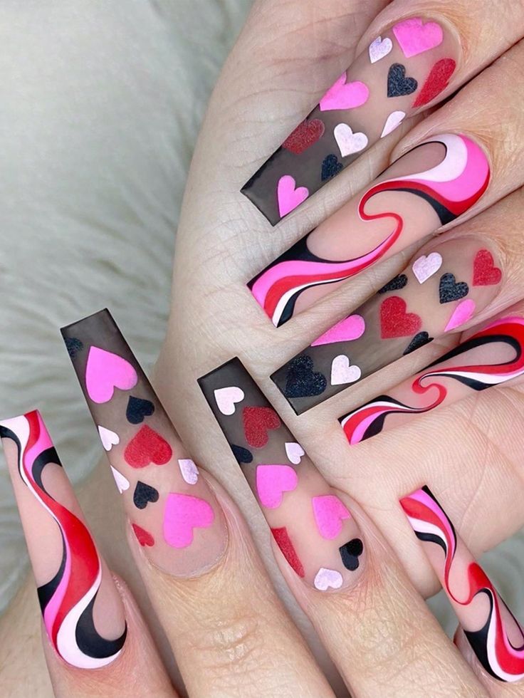 Ending our visual summer journey on a high note, these long and trendy nails are a canvas for expression. Black, white, and shades of pink hearts dance over a clear base, creating an effect that’s both cute and inspiring. The bold swirls of color add movement, suggesting the dynamic nature of summer itself. Ideal for those who embrace a playful approach to fashion, these nails are a conversation piece that will complement any summer long nails 2024 ensemble.