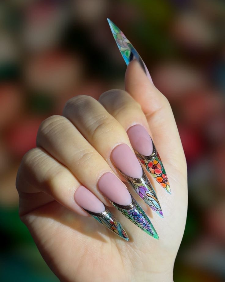 Imagine the kaleidoscopic colors of a stained glass window, now at your very fingertips. These long nails feature a design reminiscent of artisanal glasswork, with a mosaic of colors that catch the sunlight in a dazzling display. The matte pink bases on the other nails offer a soothing contrast to the vibrant spectacle, making this set a work of art for those who appreciate intricate designs. Whether attending a gallery opening or a chic rooftop party, these nails will make you the centerpiece.