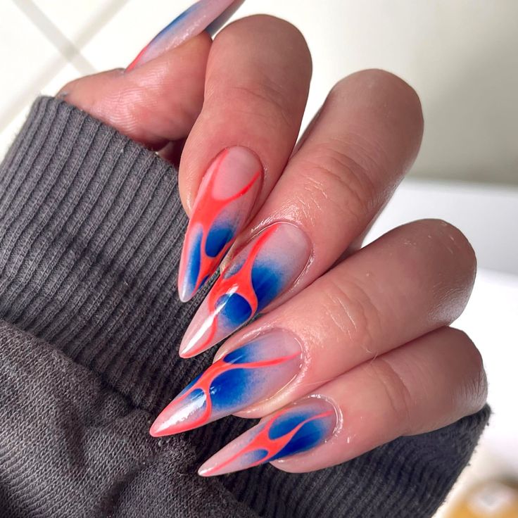 For those who adore the unexpected, these nails echo the fluidity of summer with a psychedelic swirl of blue and orange. The almond shape is a nod to classic beauty, but the design is anything but traditional. This look is perfect for those seeking a dash of inspiration and trendy flair, evoking images of sunsets melting into the ocean.