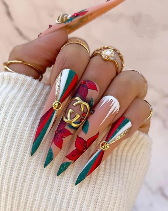 Stepping into luxury, these stiletto nails are adorned with rich colors and accented with gold, offering a perfect balance of opulence and style. The designs incorporate the brand symbols that many aspire to, making a bold statement of fashion-forward elegance. These nails are a nod to the high-end, ready for the most exclusive summer events.