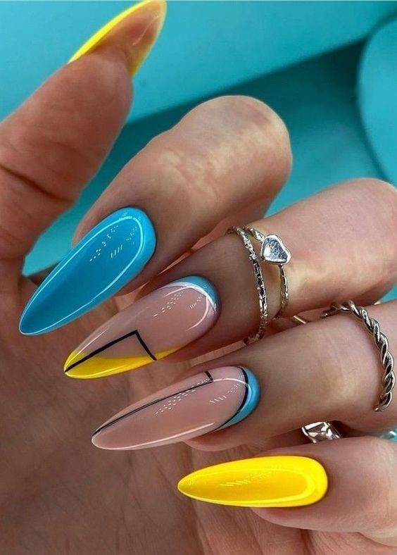 Geometry takes a chic turn with these nails, featuring sharp angles in ideas blue and ideas yellow short. These summer long nails 2024 are for the modern woman who appreciates a twist on the classic French manicure. Pair these with smart casual attire or a power suit to add an edge to your professional look.