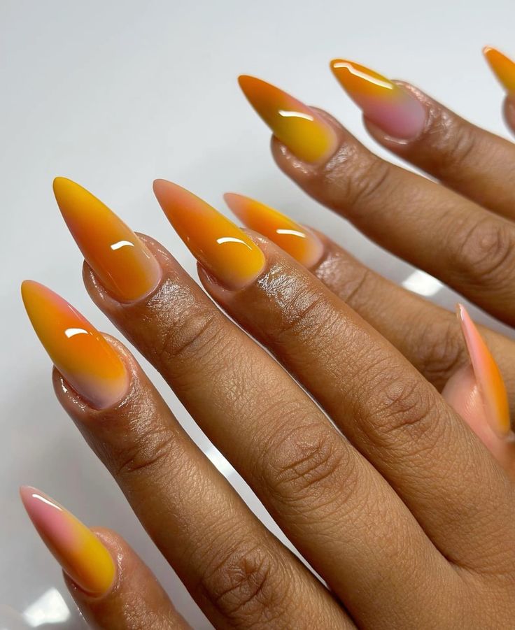 Capture the essence of summer fruits with these gradient ombre nails that transition from a tangy orange to a zesty lemon yellow. Ideal for a summer brunch or a day at the farmers’ market, these nails bring a fresh and trendy take on the ideas yellow theme. They are a match for a breezy white linen dress or a casual denim look, adding a pop of color to any outfit.