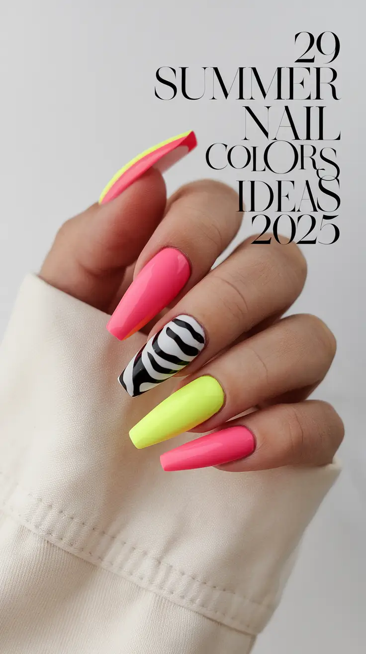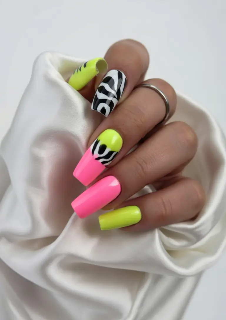 Bold blocks of acrylic bright pink and neon green are paired with black and white zebra stripes for a fierce summer statement. The combination of solid colors and animal motifs gives this manicure both intensity and daring style characteristics. The glossy polish creates an additional powerful effect on square-shaped nails, appealing to those who prefer long nails. The nail design fulfills all the emerging summer color trends for 2025 and remains popular among fashion designers.