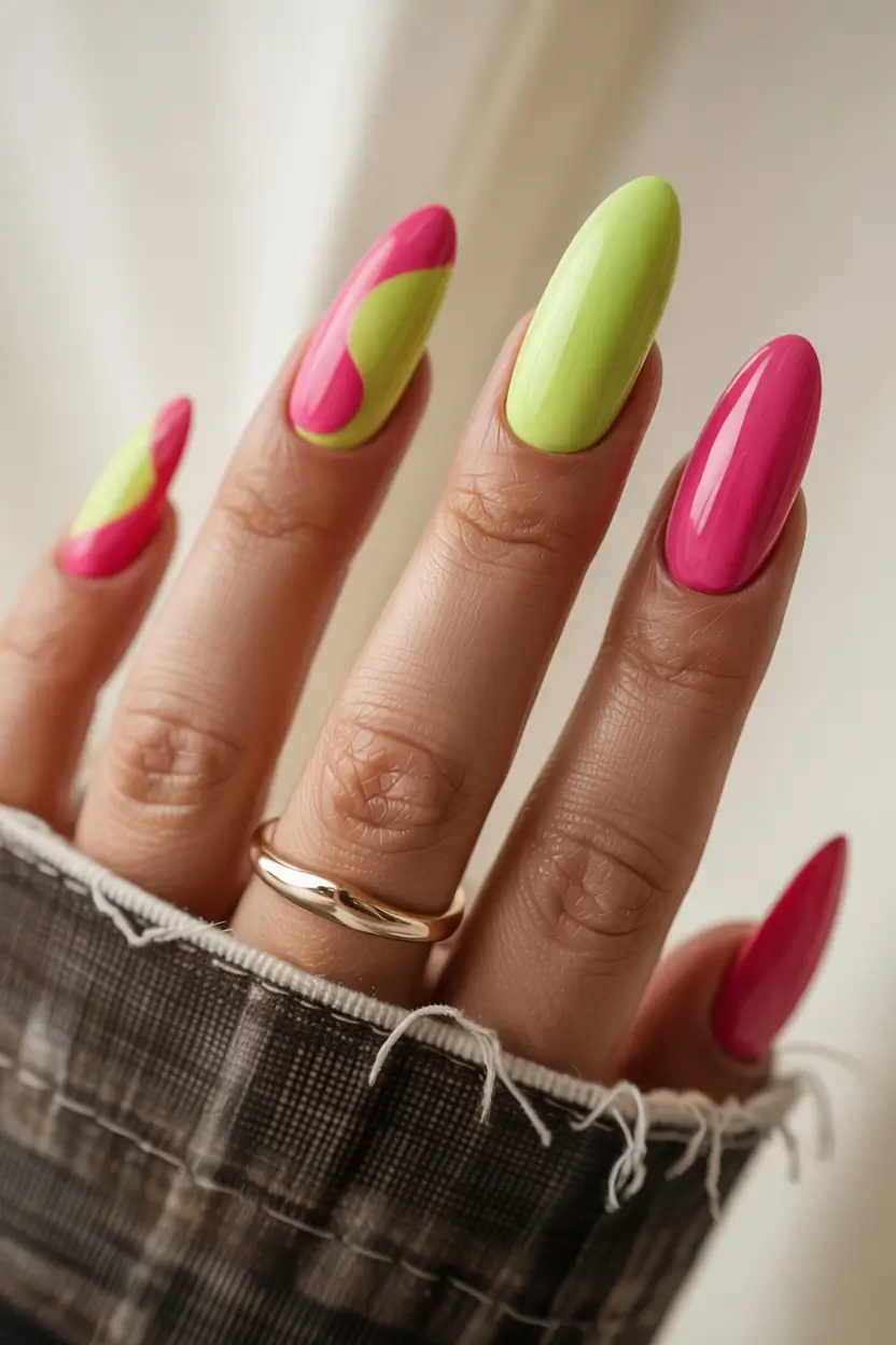 A high-gloss combination of bold neon pink and spicy lime green. The design brings together curved abstract waves that decorate smooth, full-color nails for a fun, beachy look. Only almond-shaped nails should try these intense shades, as they are ideal for sunny days and members with tan complexions. Acrylic light consumers will find this option to be their top color choice for summer 2025.