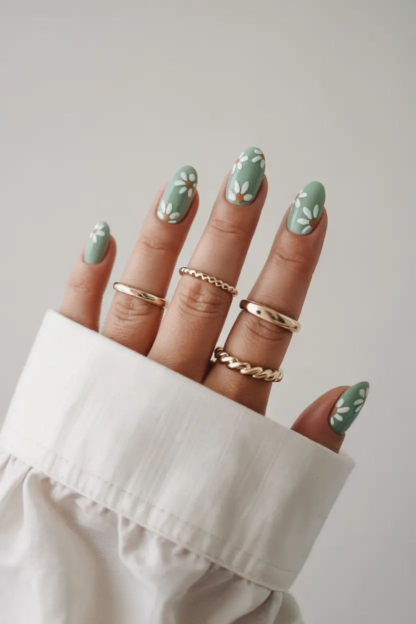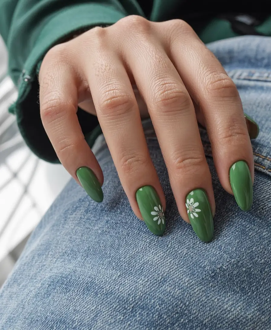 The nail design features a basic green nail polish with white daisy flowers brushed in the center for a minimal touch. A floral design element maintains both the basic simplicity and the fresh, nature-themed look. This nail style is suitable for people with tan skin tones and works well with both gel and sns application methods. This simple manicure design is suitable for warm summer outfits due to its soft appearance.
