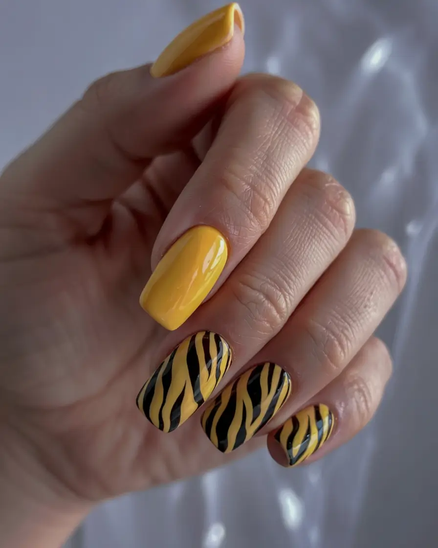 A bold combination of powerful solid bright yellow nails with aggressive black and yellow tiger pattern designs. The thick, glossy finish on the nails brings out the wild look while being suitable for daring and experimental design choices. Acrylic and gel extensions benefit from this design, which delivers the energetic summer nail color expectations for 2025. A fierce twist on the usual solid options.
