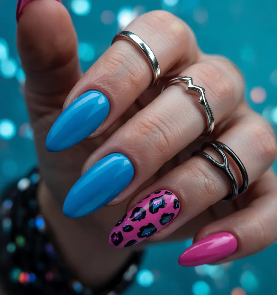 This combination of solid aqua blue and vibrant pink presents a distinctive leopard theme throughout the multi-color set. One accent nail has a pink background with black and metallic blue dots for an elegant, stylish twist. Those with almond-shaped nails should choose a high-gloss gel or acrylic finish to achieve this look. A playful and colorful choice for bold personalities this summer.