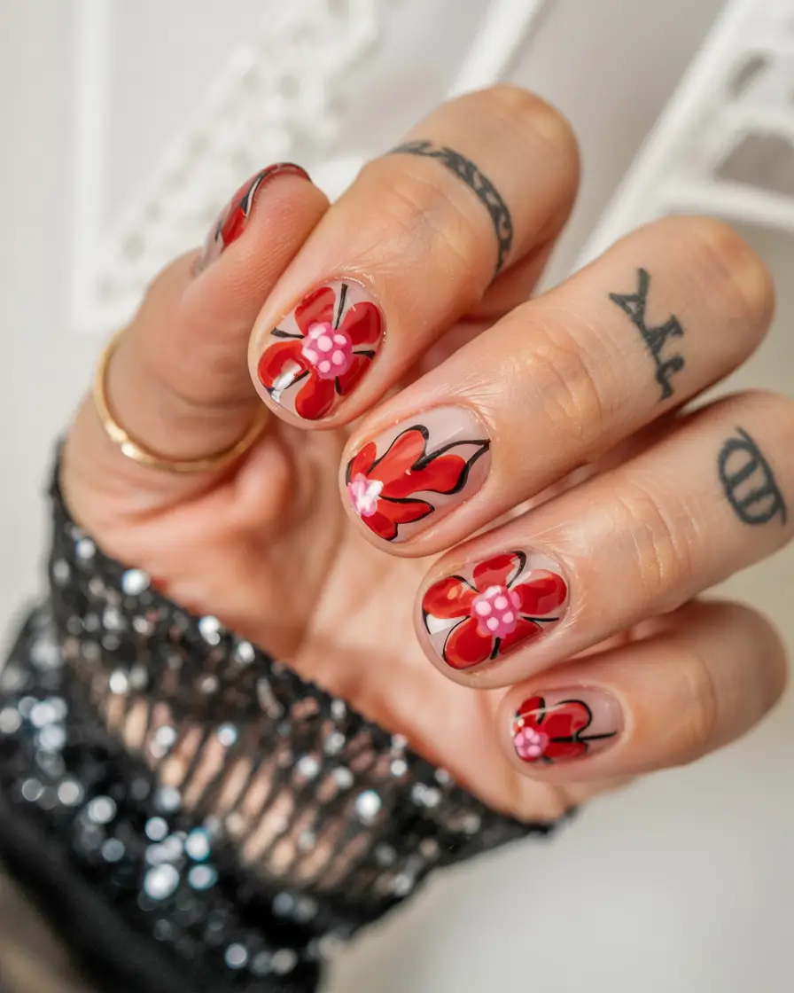 This design features bold red flowers on a clear nude background with a black outline. These short, simple nails are given depth and artistic quality through detailed work, making them ideal for those looking to express themselves creatively. The design combines polish aesthetics with artistic femininity, satisfying forward-thinking style makers in 2025. Summer 2025 nail colors offer this distinctive design opportunity.