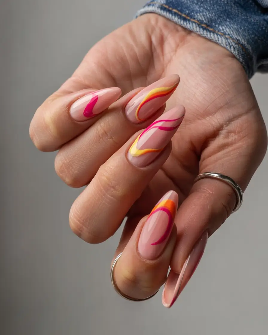 A summer nail trend combines elegant nude polish with dynamic yet elegant pink, orange and yellow ribbons for a vibrant effect. The energetic designs within a soft neutral base create an energetic balance. The style works beautifully on almond gel or acrylic base shapes for a unique blend of sophisticated look and artistic flair. This trend piece shines best during late day pool time and evening rooftop events.