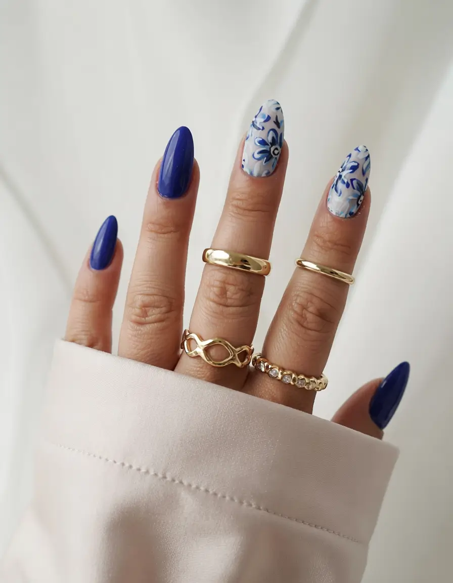 This summer nail color ideas 2025 royal ensemble combines rich, deep blue solid color with delicate hand-drawn white and navy flowers on a translucent base. The patterned flowers match classic porcelain artwork, giving the look an elite elegance. Almond gel and acrylic nails provide the best foundation for this elegant nail choice, ideal for late summer events. The aesthetic design appeals to both minimalists and art lovers with its powerful yet subtly creative appeal.
