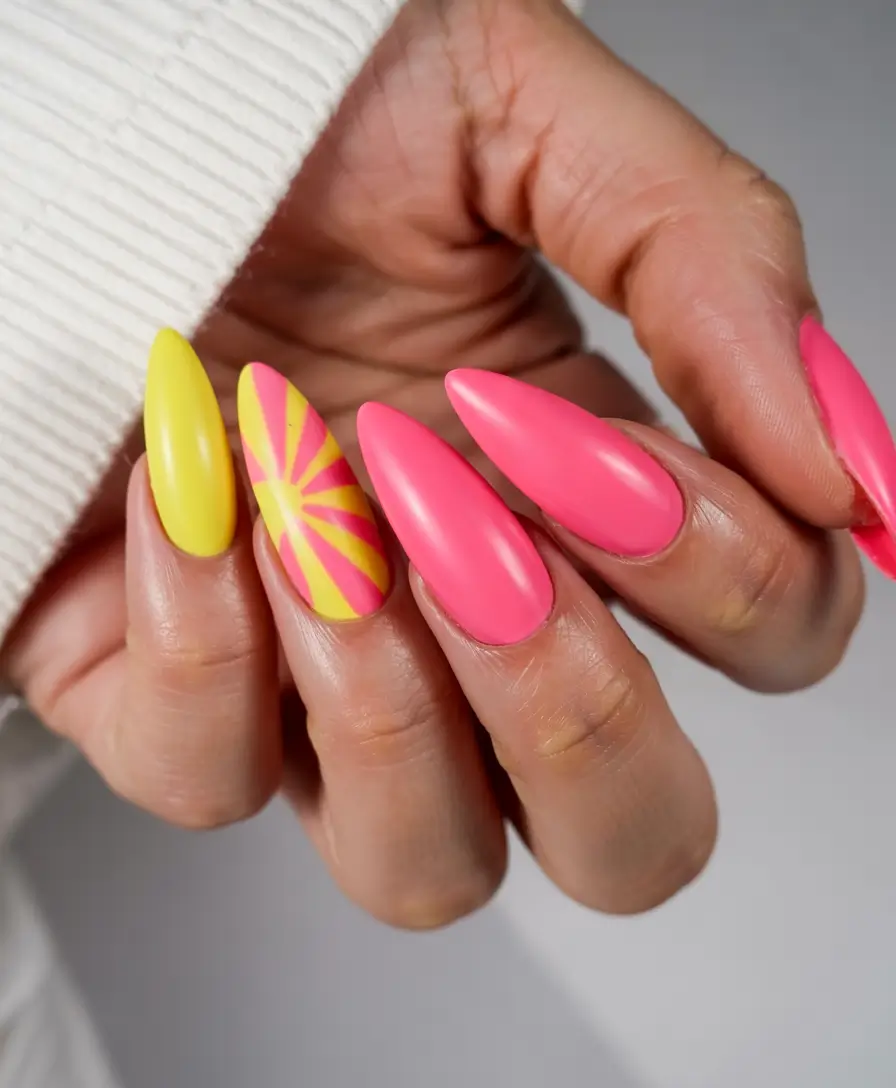 The bright acrylic design features a radiant pattern of alternating hot pink and neon yellow with a sunburst pattern in the center. The radial design pattern creates movement and a fun element with its bright approach to creating expressive shapes. A matte, flat finish transforms the manicure into a contemporary, stylish look that works best with a tanned complexion and summer joy. This design is perfect for people who want to express boldness with their summer nails.