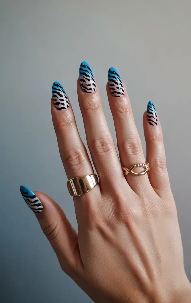 This graphic design reinvents zebra stripes with a fashionable fusion of beach blue and nude colors that fade from translucent to ocean blue at the ends. This pattern design creates an eye-catching visual effect that works well with almond nail silhouettes when used with a gel finish. This bold, modern animal print design works well for both basic and statement looks. The graphic design pattern of blue ombre offers a distinctive trend for upcoming summer nail color predictions in 2025.