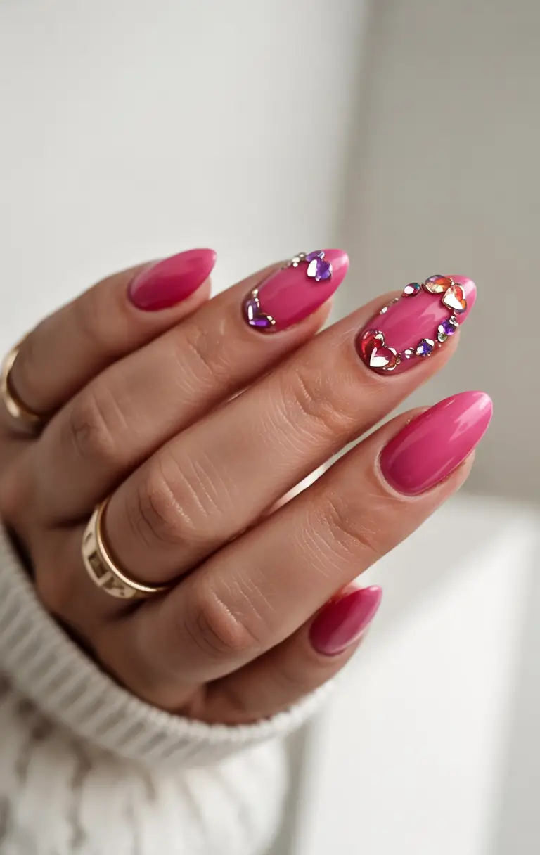 The nail ensemble features a vibrant pink color scheme made spectacular by the placement of rhinestone hearts on two precise nail tips. The elegant high shine gel finish provides a luxurious touch along with the playful romantic gems that add texture to the overall look. Acrylic and hard gel enhancements benefit the most from this style by applying a polished top coat. The Summer Nail Color Ideas 2025 collection presents this as one of its most notable choices for glamorous nail enthusiasts.