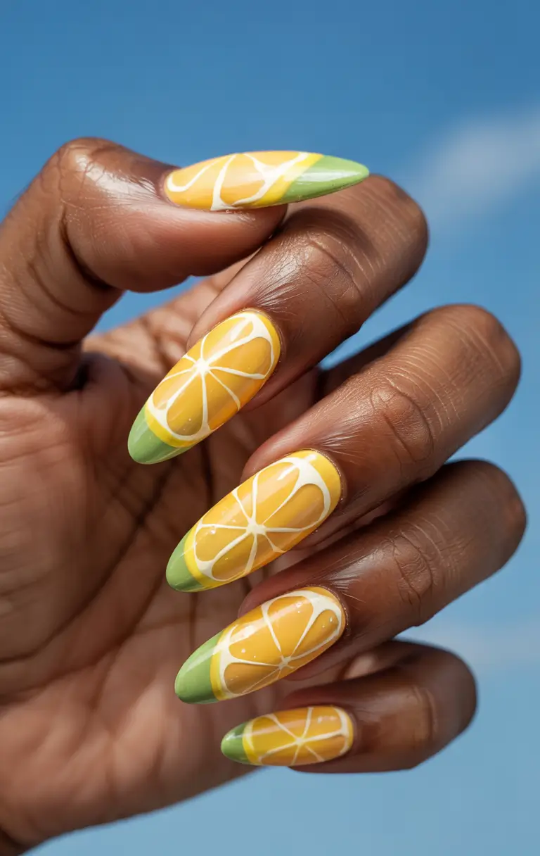 The design features fresh orange slices in a white outline over yellow rays of sunshine before ending in light green French tips. The citrus theme expresses beach-ready excitement by creating a fresh, juicy impression. This playful nail style with almond shapes works great in both gel and social media applications and presents colorful summer art in a fun way. People love to wear this design in summer because it looks great with comfortable outfits made for warm days.