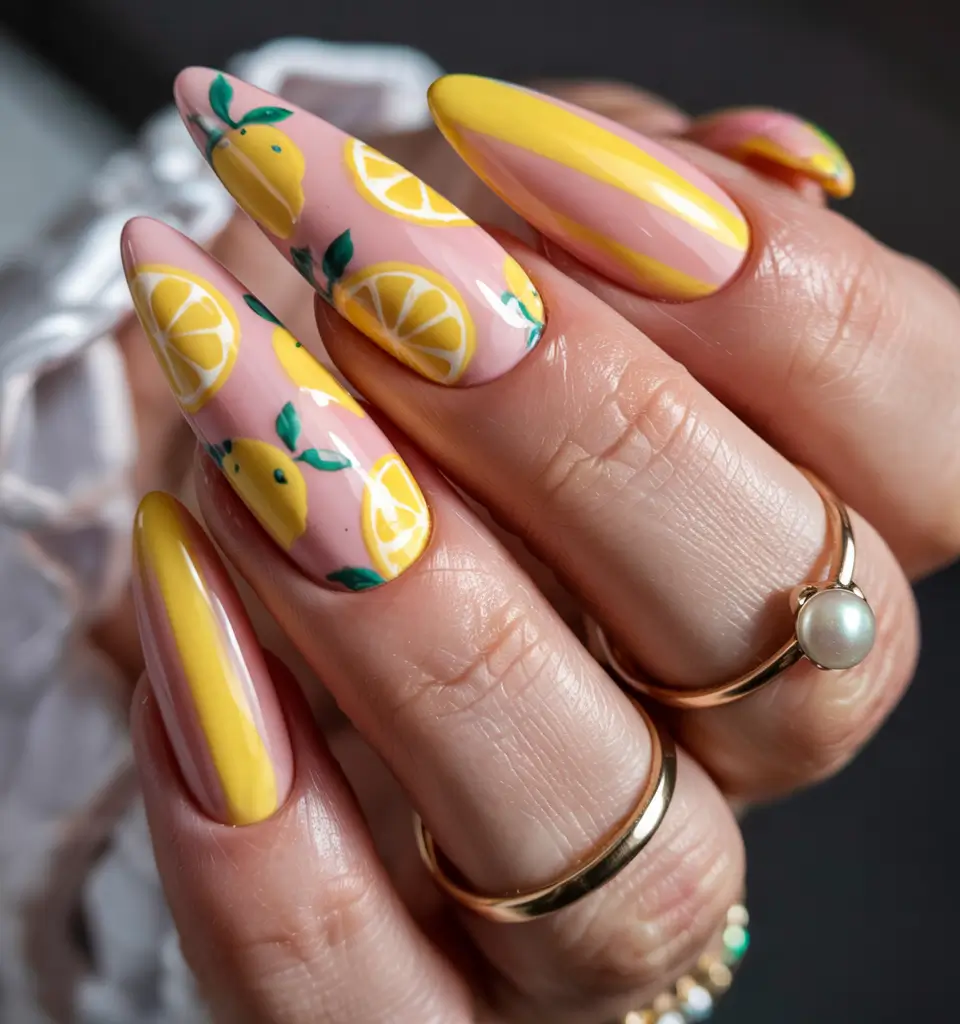 The rich details of fresh lemon slices and fruit motifs come to life on a subtle nude pink background that is accented with elegant solid yellow stripes. The cheerful palette of this design makes nail art a playful yet juicy experience during the summer months. This style goes well with almond gel shapes that need a finishing sheen. This spicy color is one of the top choices for summer nails in 2025.