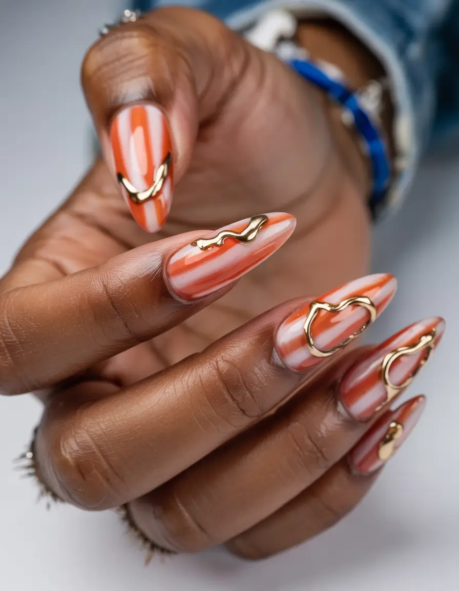 A 3DRaised gold accent transforms the appearance of nude coral and orange swirls that are beautifully paired together. The trendy, eye-catching design adds depth through its painterly elements, combining metallic texture with base movement. This sophisticated nail style shines on almond acrylic nails, especially when the wearer has tan skin. This unique combination provides a perfect blend of vibrant and high-end aesthetics for the year 2025.