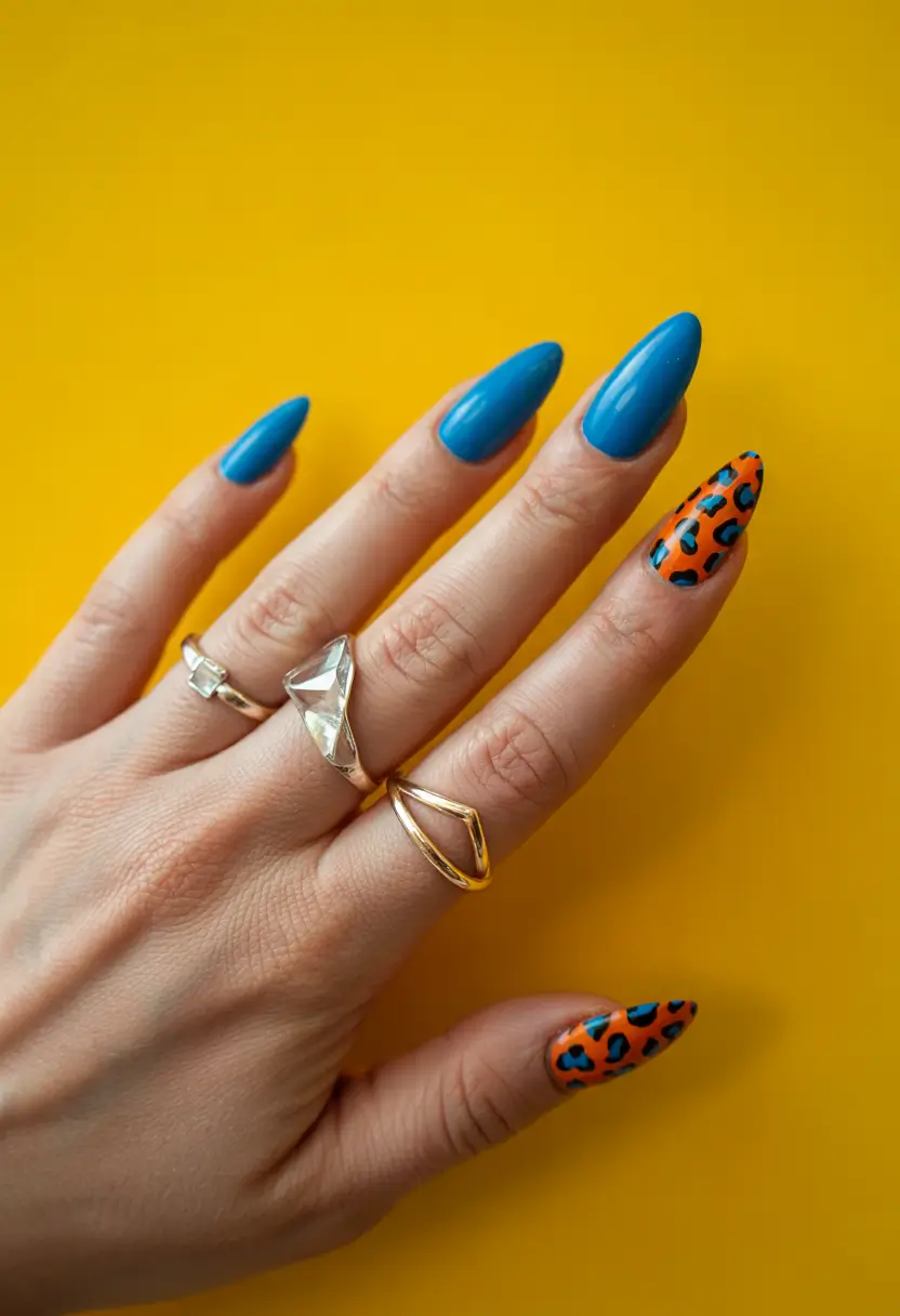 The dual nail design features clean cobalt blue solid nails contrasted with energetic orange animal prints. Two different style elements of print and minimalism create a sophisticated, dynamic design that drives contemporary fashion trends. Almond-colored acrylic nails with a glossy finish are perfect for this style. A fearless choice for summer nights and bold outfit combinations.