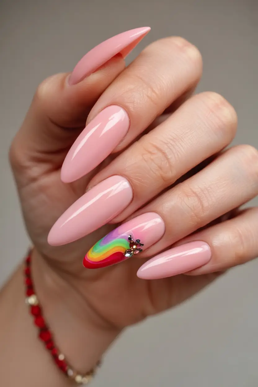 Pastel pink gets a vibrant makeover with rainbow accents on the ring finger accompanied by crystal embellishments. The elegantly curved pattern creates a charming touch that adds appropriate whimsy to basic designs. Best applied with gel for a smooth, long-lasting shine on almond or oval shapes. The pastel pink nail color is one of the most exciting summer ideas for 2025, suitable for both festive and sunny occasions.