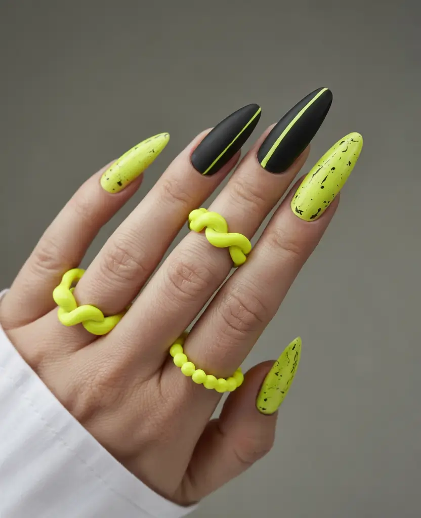 Two contrasting colors in matte black and neon yellow create an eye-catching acrylic art. The black nails are accented with black neon stripes, while the yellow nails feature chaotic speckles for a streetwear look. This sleek, edgy summer set benefits from the almond-shaped design, which adds to its elegance. All lovers of dark and light combinations must incorporate this nail style in 2025.
