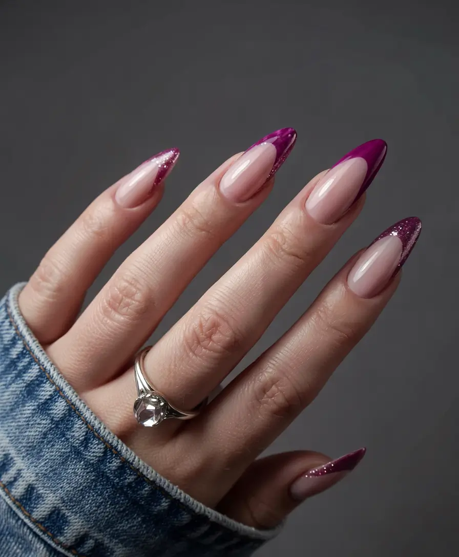 This transitional nail design uses sophisticated berry shades to create a light and transparent base. The pink hue of the tips transforms perfectly into sparkling plum shades to create an elegant ombre gradient. The shimmery shine becomes practical and suitable for everyday and casual late summer events. The almond nail shape is best finished with gel or sns applications.