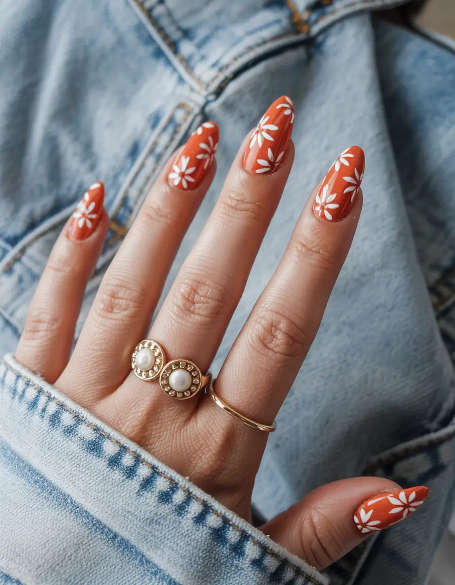 The design highlights a monochromatic orange base decorated with neat white daisy patterns. A high gloss finish deepens the floral shapes for a clean yet vibrant look. A great option for short, simple nails that still make a statement. Summer 2025 will feature this refreshing botanical nail color design among the top seasonal trends.