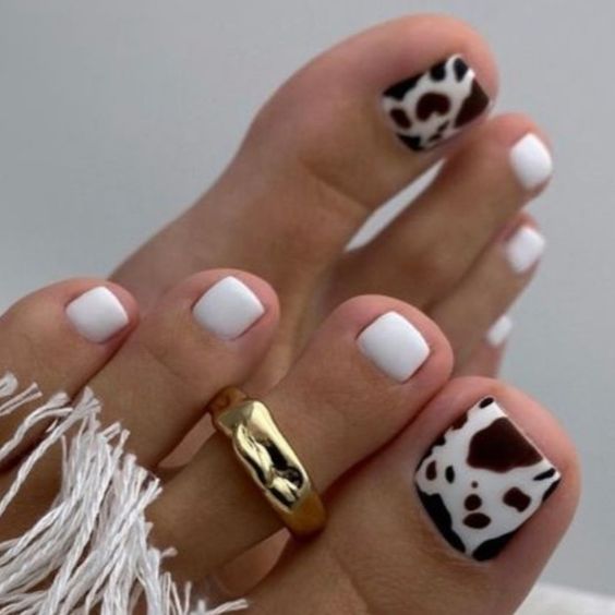 This season, simple white polish has been revolutionized with the addition of playful animal prints, creating a contrast that’s both cute and edgy. The look combines pristine white bases with a fierce cow print on the big toe, symbolizing a blend of sophistication and wildness. Perfect for those with light skin, this design offers a subtle nod to the animal print trend without overwhelming the senses. It’s an effortless way to add a pop of personality to a natural summer look, and it pairs beautifully with a golden tan and a simple gold toe ring, embodying the 2024 color trends.