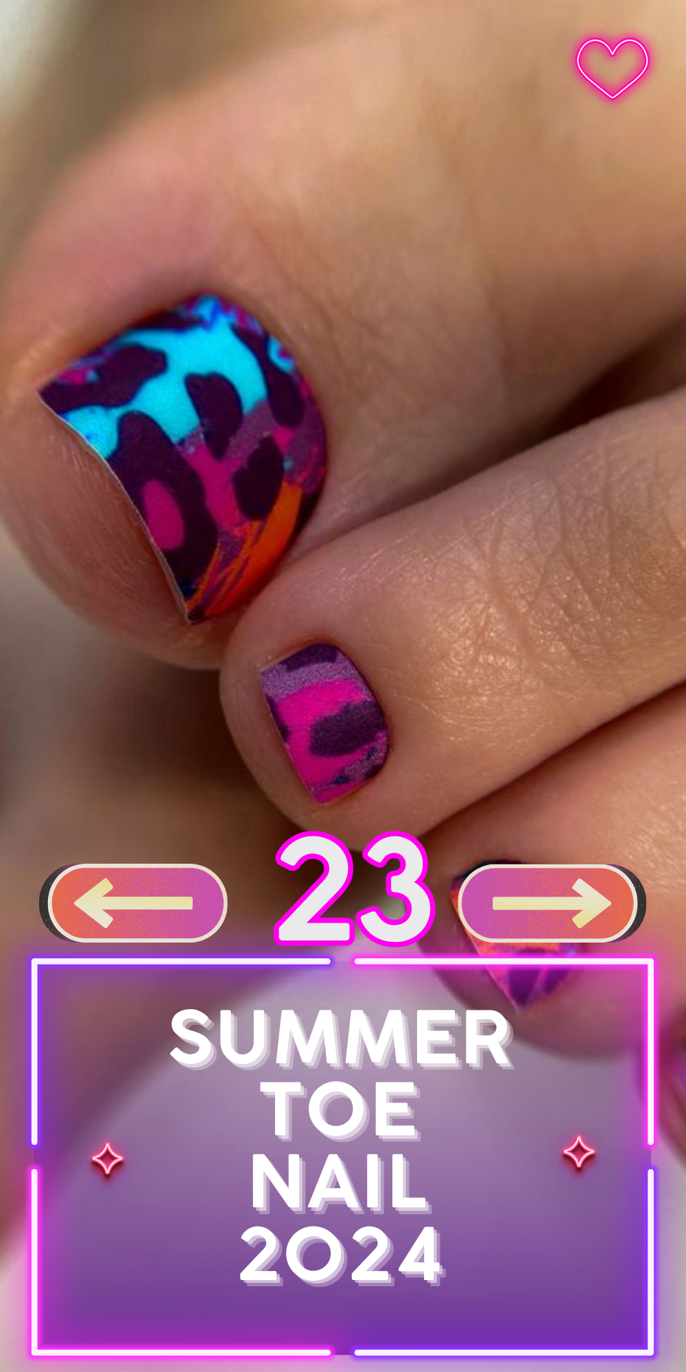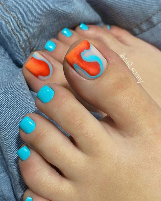 The refreshing hues of blue and orange in this abstract design are a quintessential representation of summer. This look is like a modern art masterpiece, each toe nail a different stroke of genius. It’s a bold choice for those who love colors and art, and with the 2024 gel technology, the possibilities for designs are truly endless.