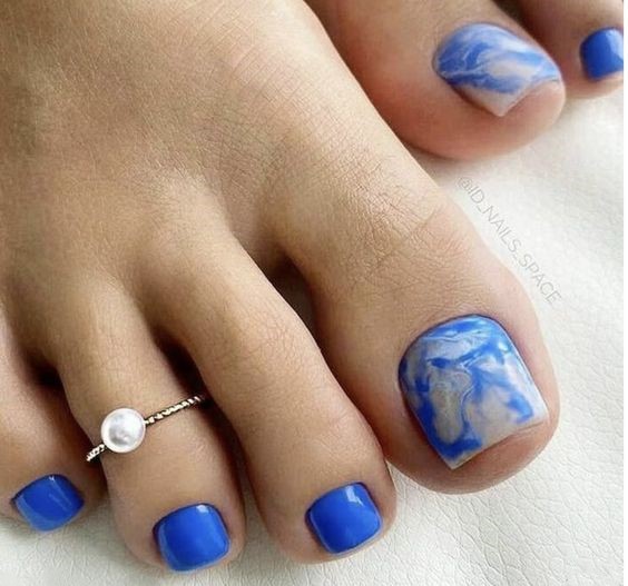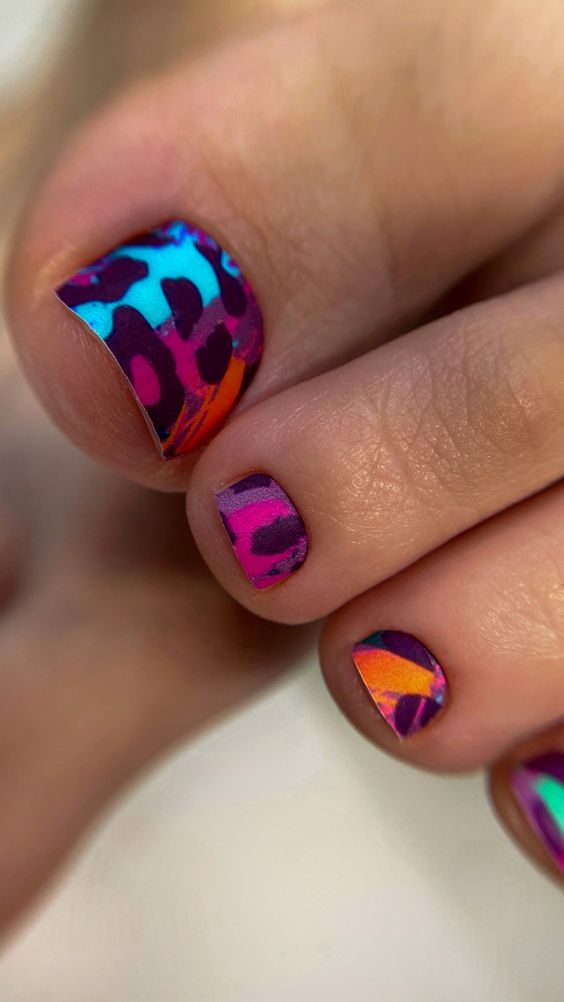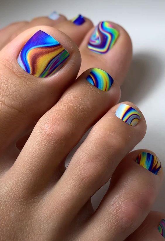 Dive into the psychedelic with toe nails that are a canvas for a swirl of colours. This captivating design features a mesmerizing array of blues, yellows, and purples, reminiscent of a summer sunset after a day at the festival. The bright hues ebb and flow in a pattern that’s as unique as it is cute, providing a punch of colour to any simple ensemble. These summer toe nails are for the bold at heart, ready to embrace the spirit of 2024 with every step.