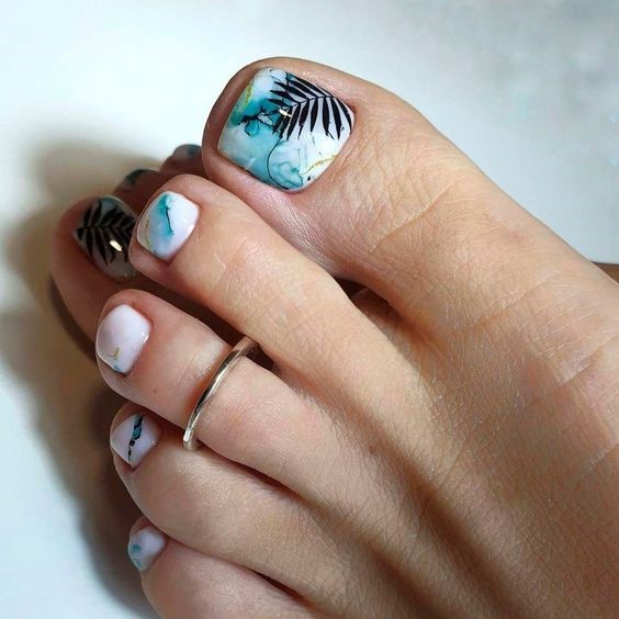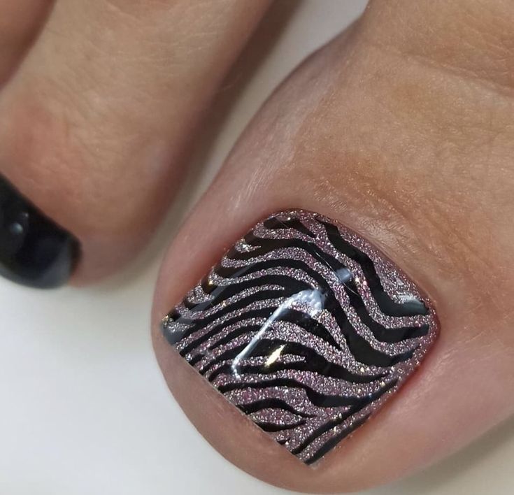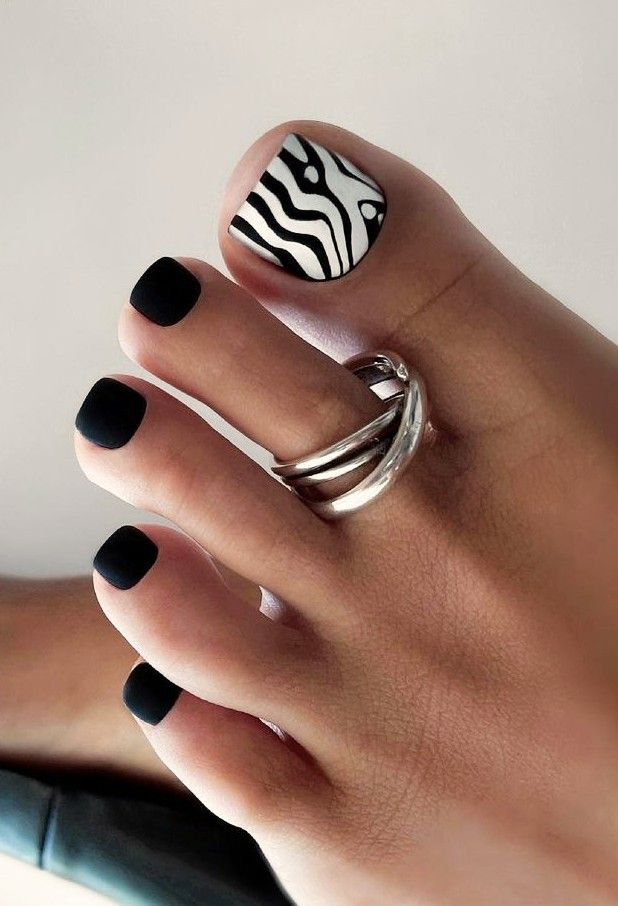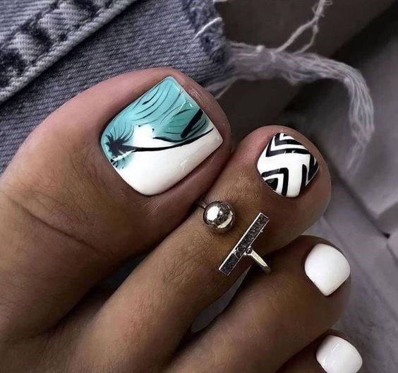 Say hello to turquoise – the color that’s taking over summer toe nail 2024. This design captures the essence of the ocean with a beautiful aqua blue that’s both calming and invigorating. The addition of zebra stripes on the big toe is a bold statement, marrying the bright blue with the art of black and white contrasts. This look is perfect for those with dark skin, as it brings a vibrant pop that complements deeper skin tones magnificently.