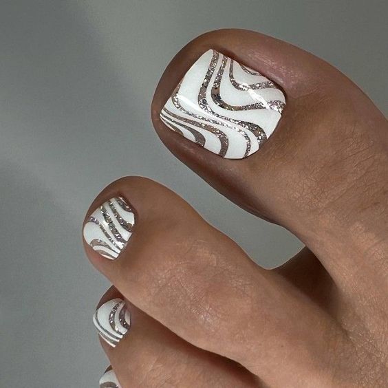 Glitter is not just for the winter holidays – it’s now a summer staple. Combining white polish with waves of silver glitter, this pedicure is for those who love to sparkle and shine. It’s a simple yet glamorous choice that pairs with any outfit, embodying a sophisticated summer vibe. This design is a perfect inspiration for a bright night out or a fancy summer dinner by the beach.