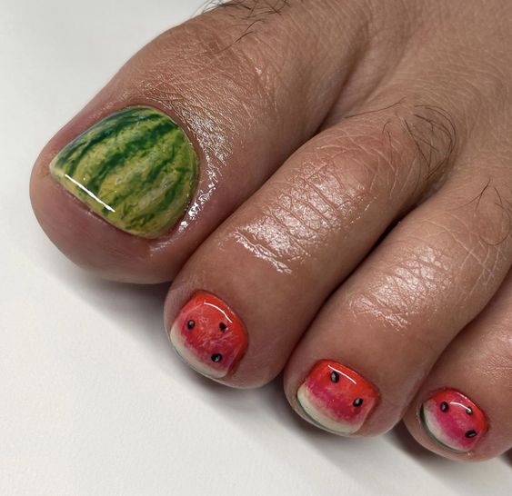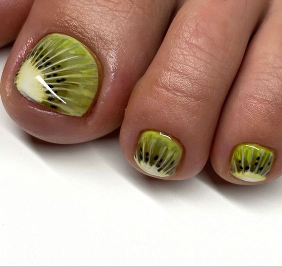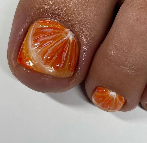 Nothing says summer quite like the fresh, bright zest of citrus. These toe nails take art to a delicious new level with a cute depiction of orange slices, embodying the essence of summer refreshment. They’re perfect for those bright, sunny days and make for a playful conversation starter at any summer gathering. This simple yet inspirational design brings a slice of joy and is sure to complement any natural tan.