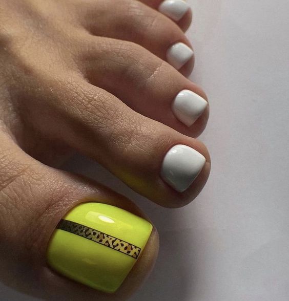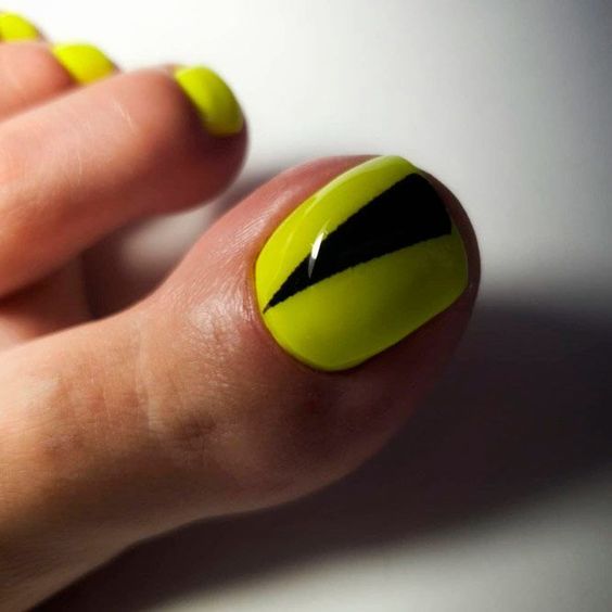 Bold and unapologetically bright, this neon yellow design with a striking black accent is a nod to the design pedicures bright colors trend. It’s a simple yet powerful statement that’s perfectly aligned with the 2024 color trends. Ideal for making a statement with colors pedicures toenails, this look is an instant mood booster and a perfect match for dark skin or light skin that craves a pop of colour.