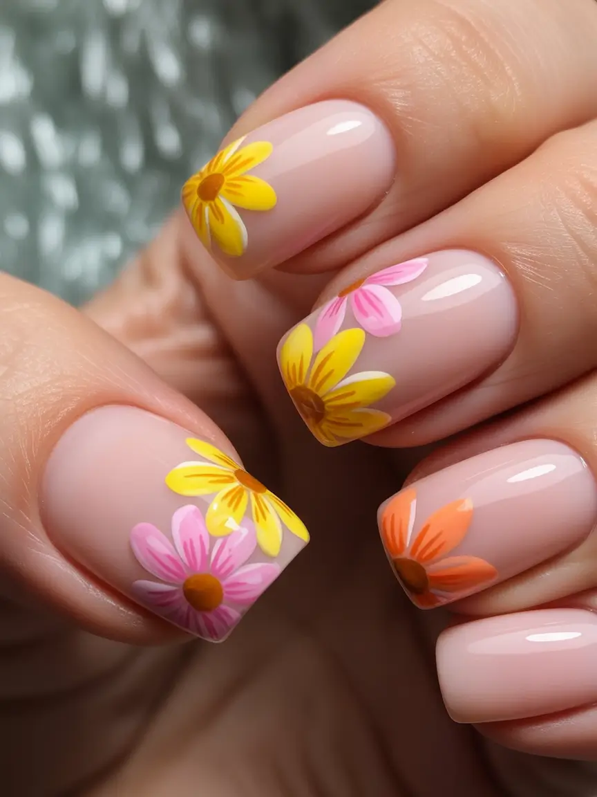 The set creates a wildflower dream that grows on top of a nude foundation base showing warm fuchsia and orange and yellow petals across round-shaped nails. The arrangement of flowers allows viewers to see the glossy pinkish-beige background which produces a clean breathable atmosphere. This nail design seamlessly blends minimalist and vibrant styles which suits both Mexican vacations in February and Italian village visits while enjoying sangria. This nail design communicates effortless planning even though it requires no extra effort.