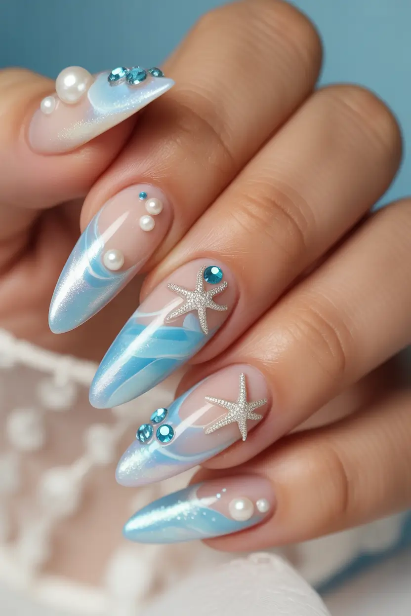 A combination of mermaid-style and contemporary elegance defines this design. The pearlescent white and seafoam blue waves on each nail are enhanced by tiny faux pearls and rhinestones which reflect light as if they were saltwater droplets. The pièce de résistance? Positioned delicately on top of the design were tiny silver starfish that provided just enough elegance without becoming excessive. The nail design creates a princess-like vacation vibe that would perfectly match a European luxury stay or a lakeside getaway.