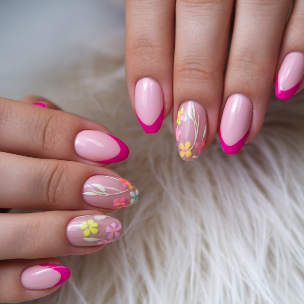 A modern twist on the classic French manicure, this design features a bold pink tip over a soft nude base. The look is elevated with delicate floral art in shades of yellow, blue, and green, adding a fresh spring and summer feel. The almond shape enhances the femininity of the design, making it perfect for any occasion. This trendy style is ideal for those who love long and short nail variations.