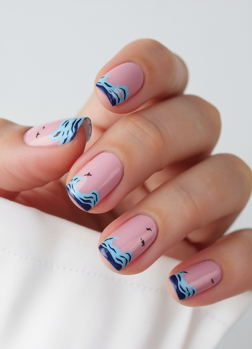 This short square nail design combines a pink base with delicate blue wave accents on the tips, creating a fresh, ocean-inspired look. Small black birds add subtle detailing, making this manicure perfect for a summer vacation or a March getaway. The gel polish finish enhances the vibrancy of the design while keeping it sleek and polished. A great choice for those who love trendy and artistic nails with a beachy vibe.